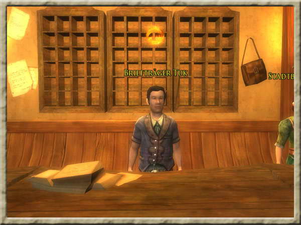 1. Sprecht mit: Briefträger Tuk Vielleicht weiß Briefträger Tuk, warum Ihr keine Antwort auf Euren Brief an Celandine Brandybock erhalten habt. Hintergrund Eure gute Freundin Celandine Brandybock hat Euch einen beunruhigenden Brief aus der Stadt Archet in Breeland geschickt, in dem sie davon schreibt, dass sich Räuber - und Schlimmeres - in der Gegend aufhalten. Ihr habt ihr einen Brief geschrieben, in dem Ihr sie dazu auffordertet, zurückzukehren, habt aber noch keine Antwort von ihr erhalten.