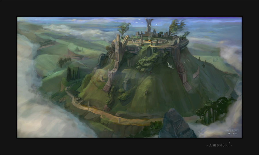 | Vor langer Zeit erbaute der erste König von Arnor, Elendil, den Turm Amon Sûl im Zentrum seines Reiches, inmitten der Wetterberge. Er sollte einen Palantír beherbergen – einen der sieben "sehenden Steine " durch die Elendil, seine Erben und ihre Vasallen miteinander kommunizieren und über die nördlichen und südlichen Reiche wachen konnten. |