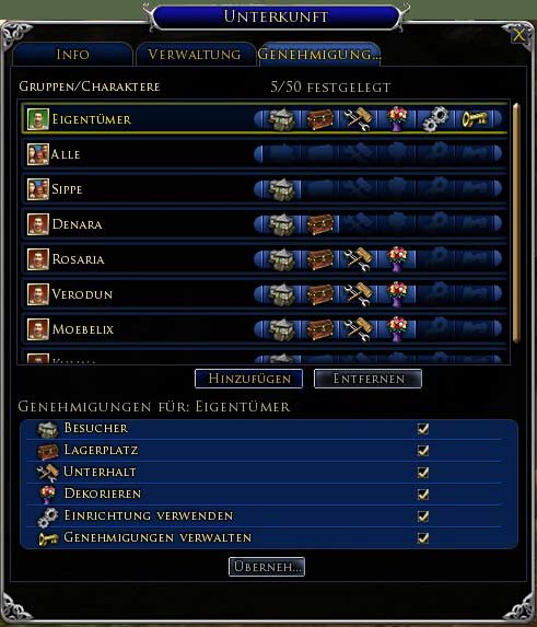 Unter dem Reiter "Genehmigungen" stellt Ihr die Berechtigungen für Euer Haus ein. Folgende Rechte können pro Eintrag in der Liste verteilt werden: |