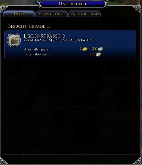 Als Häuser stehen Euch in den einzelnen Siedlungen rassenspezifische Häuser zur Verfügung. Einfaches (T1) Haus für im Durchschnitt 1 Gold Luxus-Haus (T2) für durchschnittliche 7 Gold Sippenhaus für gemittelte 15 Gold. Allerdings wird für den Kauf eines Sippenhauses ein Sippenrang von 7 benötigt. |