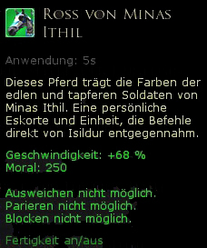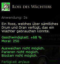 Das Ross des Wächters muss stark und ausdauernd sein, um das Gewicht der schweren Rüstung und Waffen seines Herrn zu tragen. Dieses kräftige Ross hat ein attraktives stahlgraues Fell mit einem langen Schweif und sein robustes Sattelzeug ist ideal, um Waffen, Schilde und Vorräte für eine lange Reise in den Krieg und in Gefahren zu tragen. Dieses Ross verfügt über 250 Lebensenergie und ermöglicht es Ihnen, 68 % schneller als zu Fuß zu reisen. Das Ross konnte man mehrfach in der Lotterie gewinnen, bevor es im Shop eingefügt wurde. Angebot zeitlich begrenzt: 23. November bis 8. Dezember 2011 |