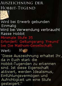Die Ruf-Belohungen der Mathom-Gesellschaft sind eher für Rollenspieler geeignet. Sie mögen dem Normalspieler eher als Sinnlos erscheinen. Lediglich die "Auszeichnung der Hobbit-Tugend" könnte für alle Spieler interessant sein. |