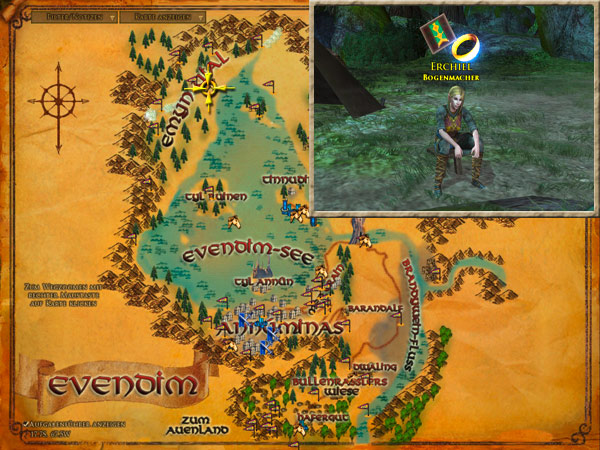 Erchiel ist im Traufenspitz am nordwestlichen Ufer des Evendim-Sees. Ihr solltet zu Erchiel zurückkehren und ihr von Eurem Überfall auf die Gauradain berichten. |
