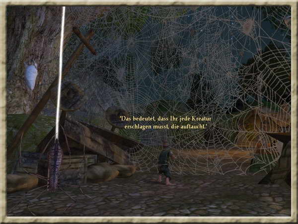 8. Besiegt Spinnen (3/3) Während Grenzer Boffin versucht, sich durch die Spinnennetze zu hacken, solltet Ihr ihm die Spinnen vom Leib halten, die sicher versuchen werden, ihn aufzuhalten. Als ihr Euch auf den Weg zum Hof des Alten Odo gemacht habt, fandet Ihr den Weg von Spinnennetzen versperrt. |