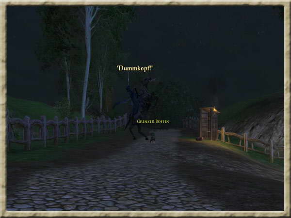 3. Ihr solltet mit Grenzer Boffin sprechen. Während Ihr auf der Straße nach Stock gereist seid, habt Ihr einen seltsamen, schwarz gekleideten Reiter gesehen. Er schien ausgesprochen interessiert daran, den Verbleib eines Hobbits namens "Beutlin" zu erfahren. Nachdem er Grenzer Boffin fast zu Tode erschreckt hat, ist er weitergeritten. |