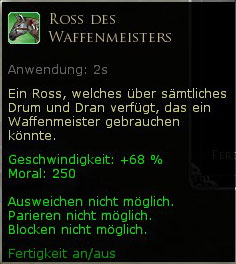 Das Ross des Wächters muss stark und ausdauernd sein, um das Gewicht der schweren Rüstung und Waffen seines Herrn zu tragen. Dieses kräftige Ross hat ein attraktives stahlgraues Fell mit einem langen Schweif und sein robustes Sattelzeug ist ideal, um Waffen, Schilde und Vorräte für eine lange Reise in den Krieg und in Gefahren zu tragen. Dieses Ross verfügt über 250 Lebensenergie und ermöglicht es Ihnen, 68 % schneller als zu Fuß zu reisen. Das Ross konnte man mehrfach in der Lotterie gewinnen, bevor es im Shop eingefügt wurde. Angebot zeitlich begrenzt: 23. November bis 8. Dezember 2011 |
