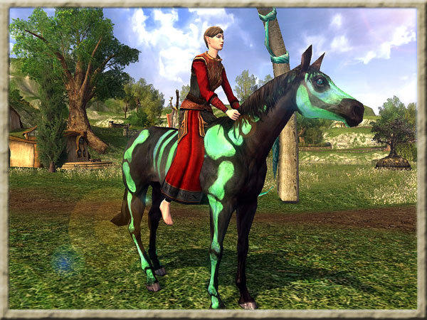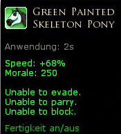 Ein in der Dunkelheit leuchtendes, bemaltes Skelett-Ross, tiefschwarz gefärbt und mit leuchtend grünem Skelettknochen-Muster! Dieses Ross verfügt über 250 Lebensenergie und ermöglicht es dem erwerbenden Charakter, 68 % schneller als zu Fuß zu reisen. Für Sie nicht schnell genug? Probieren Sie eine Verbesserung: Reittiergeschwindigkeit! Nur im HdRO-Shop erhältlich! |
