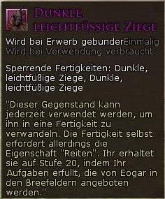 Eigentlich als "Die Belagerung des Düsterwalds" Pre-Order-Reittier ins Spiel eingefügt steht diese Ziege nun auch im HdRo-Shop zum Kauf bereit. Zeitweise gab es diese Ziege auch als Teil eines Abenteurerbündels beim Kauf einer PC-Zeitschrift. Lernt, eine Ziege herbeizurufen. Dieses Ziege hat 60 Punkte Lebensenergie und erlaubt dem Charakter, der es kauft, 62 % schneller als zu Fuß zu reisen. Die Fertigkeit, dieses Reittier herbeizurufen, wird dem Charakter beim Kauf automatisch verliehen. Nach dem Kauf findet Ihr diese Fertigkeit im Bereich für Reittiere im Fertigkeitenfenster (drückt 'K' und klickt dann auf die Registerkarte für Reittiere). HINWEIS: Im Gegensatz zu Pferden, kann diese Ziege auch in den Tiefen von Moria verwendet werden. |
